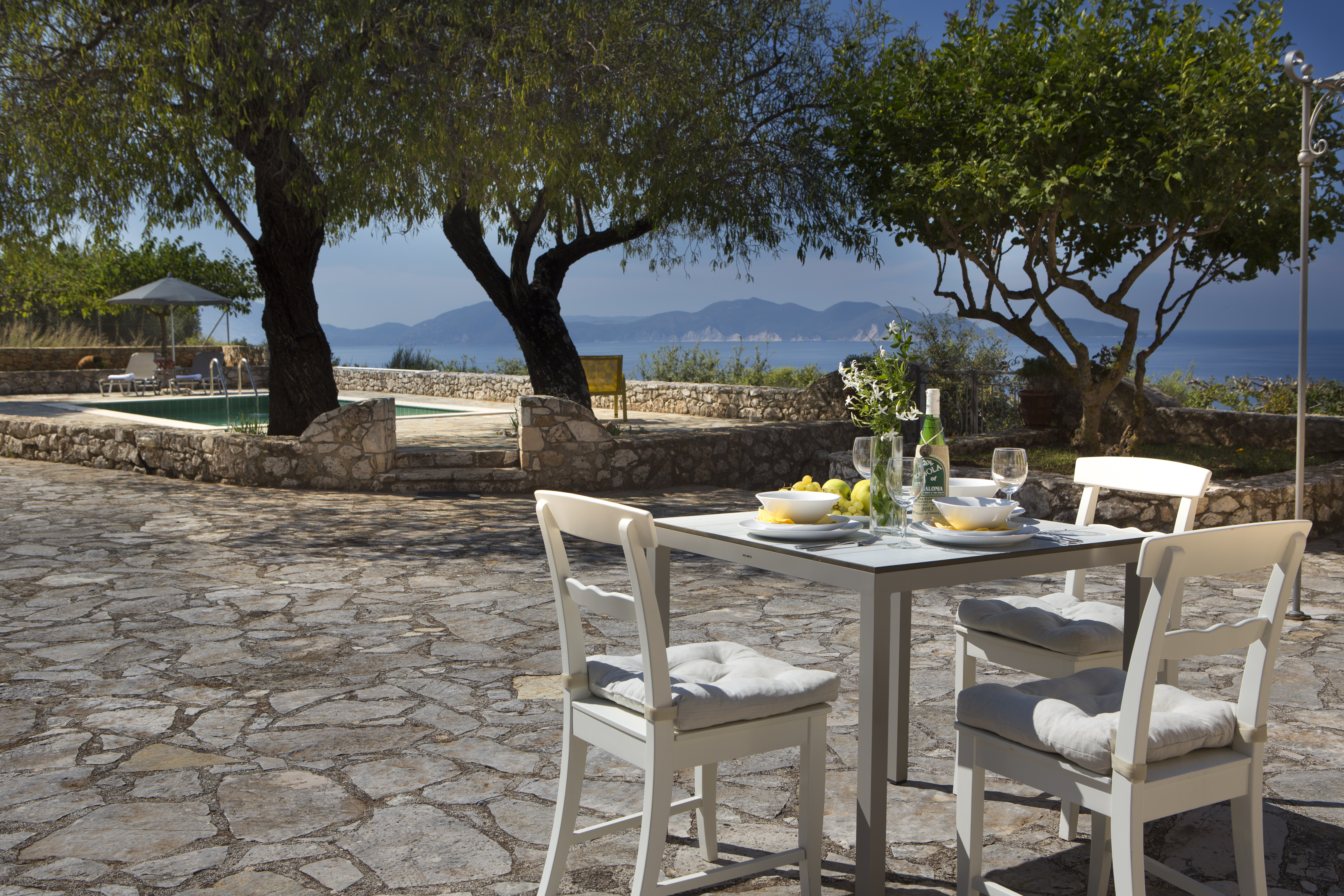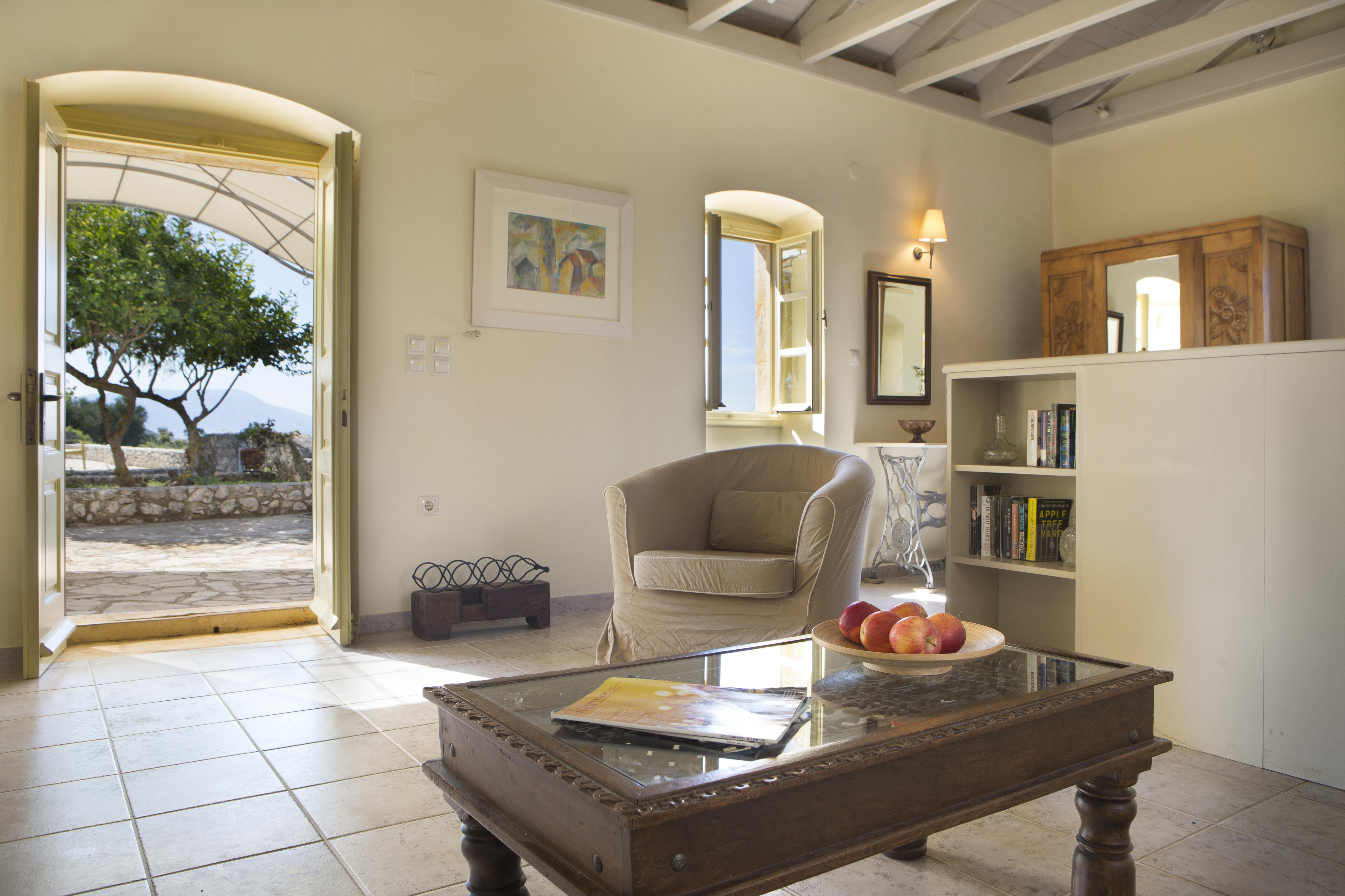 The accommodation is all on one level with high vaulted, colour washed pine ceilings which create a cool, spacious interior and by using natural materials such as wood and stone together with comfortable furnishings, a tranquil ambience has been created inside. The living area is open plan, comprising a bedroom area, which is separated by a low wall from the lounge, dining and kitchen areas. Doors not only allow the light to flood into the cottage but also lead out onto the large terrace where you can eat or just sit and enjoy the fantastic views across the sea to the Lixouri peninsular on the horizon. The terrace area also gives you easy access to the garden and swimming pool as well. The sunsets especially, where Lemoni is situated, are really stunning and not to be missed!