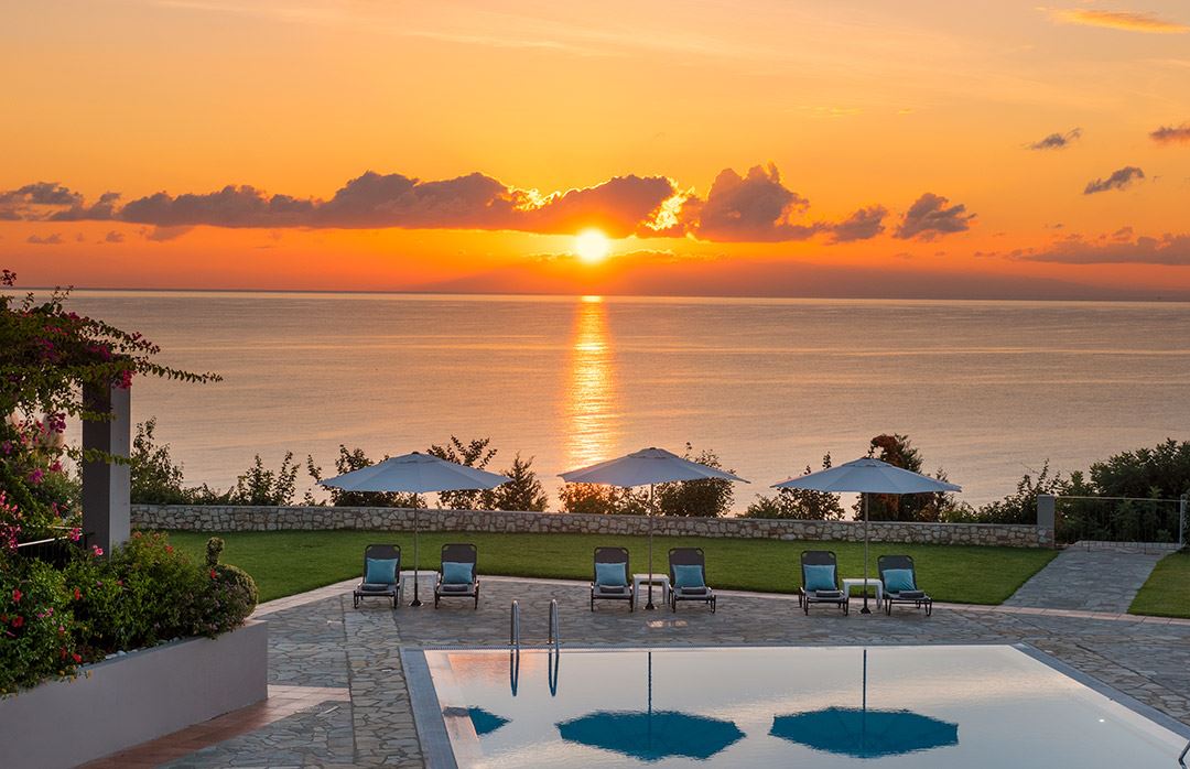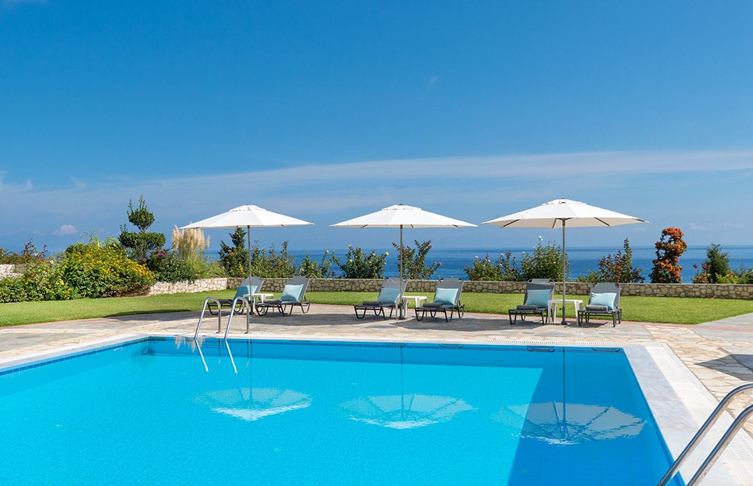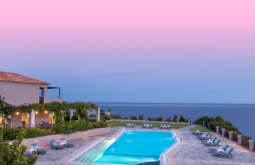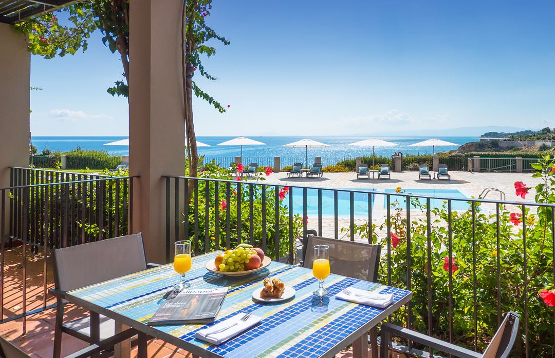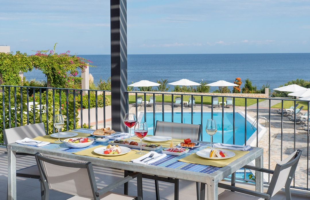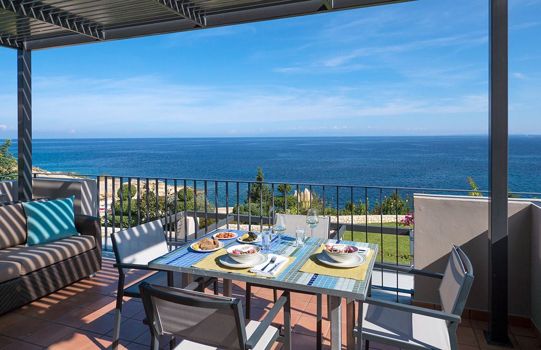 The Skala Dawn suite is situated on the ground floor and has both a pool and sea view with a large balcony.
