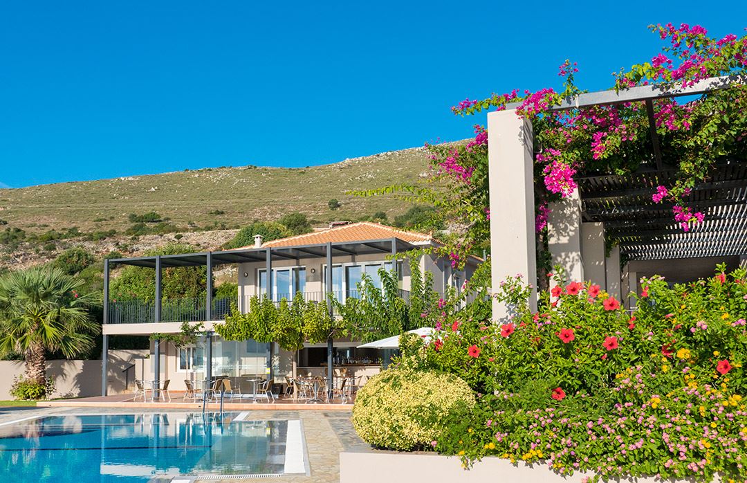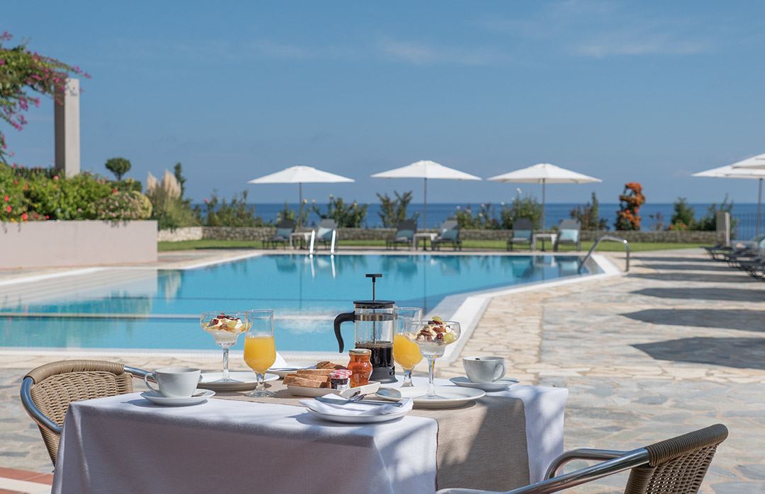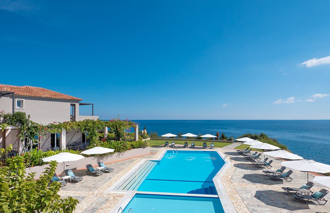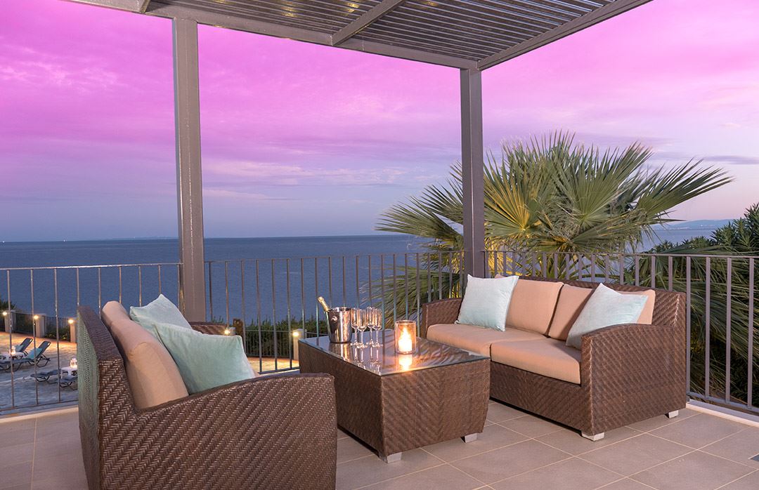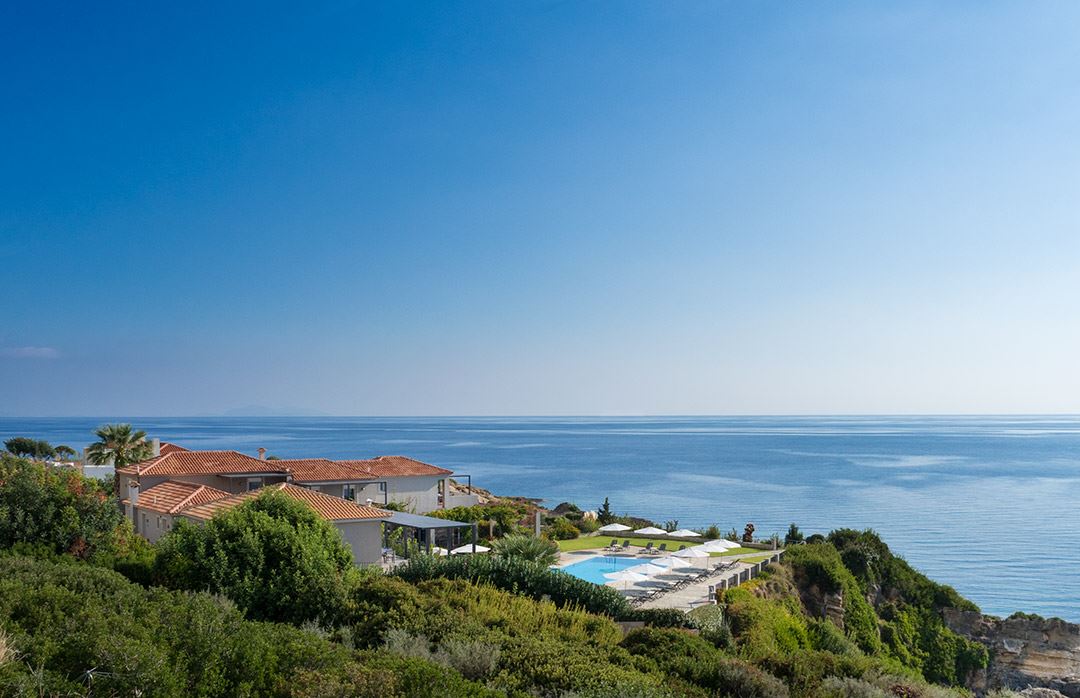 The Skala Dawn suite is situated on the ground floor and has both a pool and sea view with a large balcony.